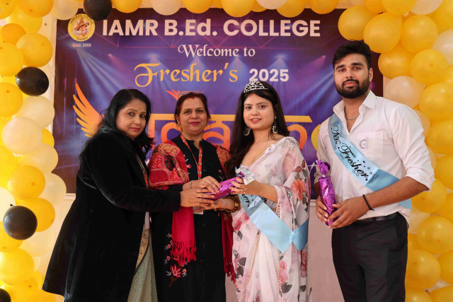 A grand freshers party 'UDAAN' was successfully hosted by IAMR B.Ed college , Duhai Ghaziabd on 29 th November 2025. The program commenced with the lamp lightning by chief guest chairperson Anshu Bansal , secretary sanjay Bansal ,Group Director Dr.P.K vashistha & principal of IAMR B.Ed college Dr. Abha srivastava.Group Director of IAMR group of institutions Dr. P.K Vashistha sir inspired & encouraged students by his speech . The event featured a dazzling array of cultural performances including dance , musical acta & enjoyable games . The highlight of the event was the Mr. fresher & Miss fresher's competition 2025 following intense rounds, Gagan verma was crowned Mr. fresher and Aradhya choudhary was declared Miss Fresher.All the faculty members were also presented.